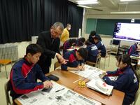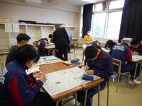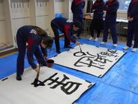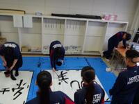 5時間目からは、生徒それぞれが「今年一年を表す漢字」「高校生活を表す漢字」「好きな漢字」のテーマから漢字一字を選び、大きな紙に寄せ書きしました。まずは通常の半紙に練習してから、大きな紙と大きな筆で書きましたが、生徒たちは初めての体験に楽しみながら取り組んでいました。