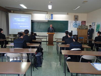2月6日(木)5・6校時、本校視聴覚室・各教室にて、「進路ガイダンス(出前授業)」を実施しました。開講講座は9講座(7校)で行われました。生徒は5時間目第一講座と6時間目第二講座をそれぞれ受講しました。オンラインでの講座や対面で実際の道具を使った講座もあり、それぞれの職業について詳しく説明を聞くことが出来ました。生徒たちにとって、今後の進路活動に役に立つ有意義な時間となりました。講師の皆様に大変感謝いたします。ありがとうございました。