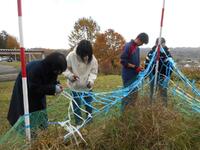 今年も例年通り、生徒たちが力を合わせて杭打ちをして支柱を立て、小動物対策のネットを地面に近いところに張り、上はビニールテープでネットを編んで鹿が飛び越えないようにしました。