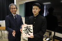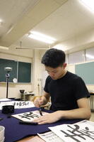 5時間目からは、生徒それぞれが「今年一年を表す漢字」「高校生活を表す漢字」「好きな漢字」のテーマから漢字一字を選び、大きな紙に寄せ書きしました。まずは通常の半紙に練習してから、大きな紙と大きな筆で書きましたが、生徒たちは初めての体験に楽しみながら取り組んでいました。